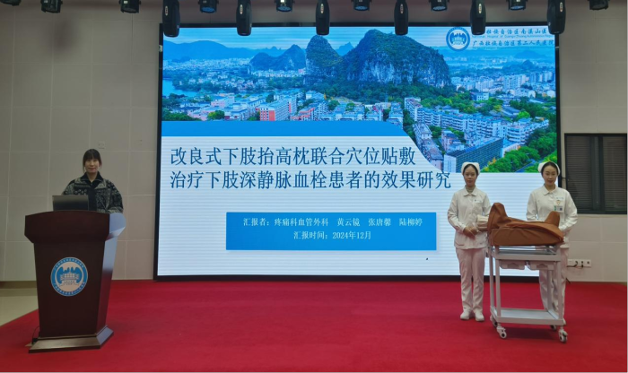 比赛中,各项目代表依次登台,各科室结合自身专科特点,运用质量管理工具进行项目汇报,从护理实际工作出发,聚焦临床问题,围绕设定护理质量改善与患者结局、护理质量指标监测与管理实践、护理创新与护理质量提升、人文与护理服务质量提升等内容进行全面汇报,科室借助精心制作的PPT、详尽的数据对比以及生动的案例分享,生动展现了护理质量改善项目成果,每一个项目都紧密围绕患者需求,致力于为患者提供更安全、高效、优质的护理服务。经过激烈角逐,疼痛血管外科的《改良式下肢抬高枕联合穴位贴敷治疗下肢深静脉血栓患者的效果研究》获得一等奖。