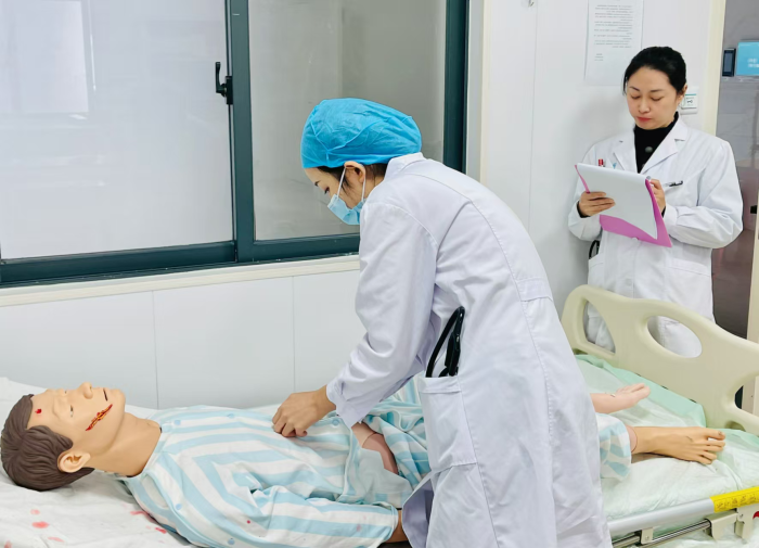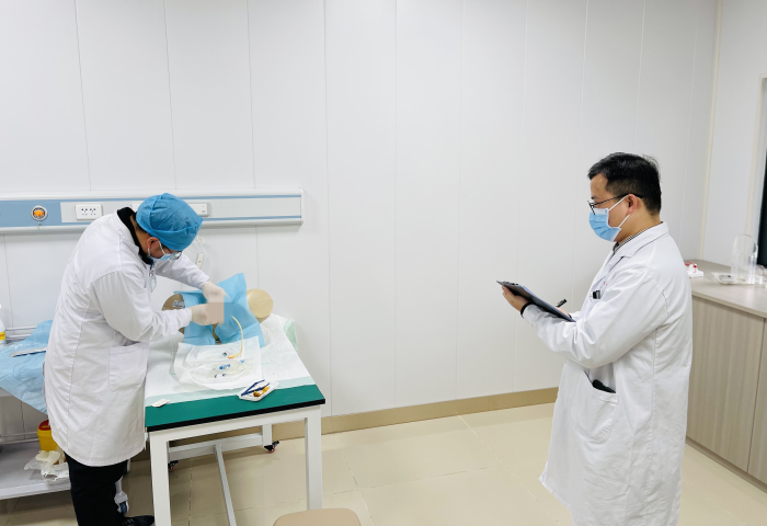 第一站基本技能操作,涵盖心肺复苏与男性导尿两项关键操作。学员们在模拟场景中冷静应对,有条不紊地展示着扎实的操作功底。