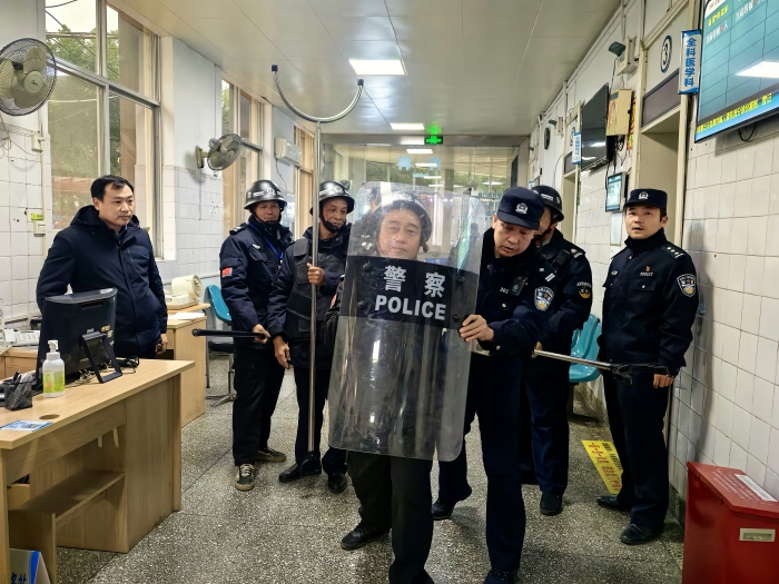南溪山医院副院长胡长付和将军桥派出所副所长段保坤现场观看了演练,演练结束后,段保坤副所长首先指出了此次应急演练中存在的问题,随后结合医院常见暴力案件的特点,精准有效地讲解了应对相似突发事件的应对办法,同时现场示范了盾牌、钢叉、脚叉等防暴器材的使用方法,指出各种防护器械的使用技巧,手把手指导安保人员如何正确使用防护器材,并对最小应急单元战术“二对一”、“三对一”进行了重点培训。胡长付副院长强调,面对突发事件,医务人员要以群众和自身生命安全为前提,依照应急预案冷静处置,及时报警和疏散人群;安保人员要加强技能培训和实战操练,做到“召之即来,来之能战”;医院各部门要定期进行反恐防暴等应急演练,加强应急预案的动态管理,改进和完善应急预案体系,提高应急管理工作水平,确保应急预案人人知晓,应急处理人人掌握,扎实推进“平安医院”建设。