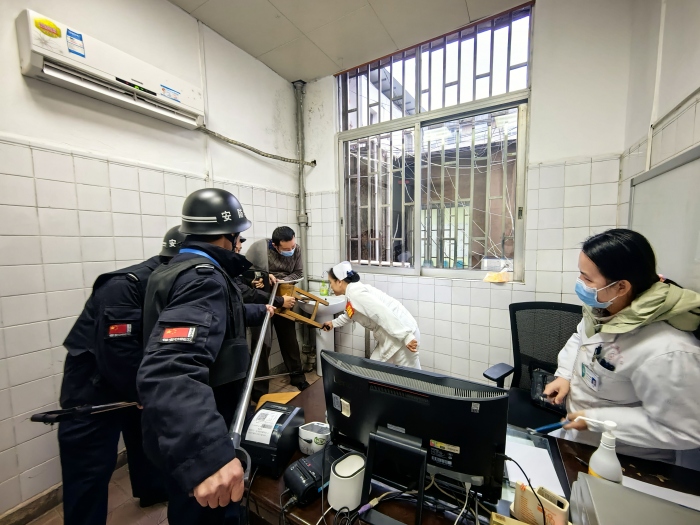 此次演练采取不预先通知的方式进行,演练模拟了“暴徒”在医院门诊诊室手持道具欲对医生行凶,面对突发险情,护士立即启动110一键报警装置向公安机关报警,同时按照应急预案开展行动,医院安保人员在接收到报警信息后,安保人员手持防暴器材迅速赶到事发处将“暴徒”控制,与此同时,民警接警后迅速赶到现场,开始对“暴徒”进行抓捕,在公安民警和医院安保人员的共同配合下,“暴徒”被顺利制服。