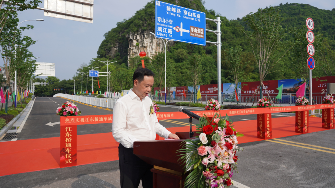 七星区委常委、政法委书记、塔山片区改造项目指挥部指挥长赵树刚同志在致辞中指出,江东桥是七星区2022年建设规划的重点工程,它的顺利竣工通车,连通了穿山小街与毅峰路,对提升七星区及桂林城市形象、改善区域交通状况、加强片区交流、拉动片区经济发展,具有十分重要的现实意义和历史意义。