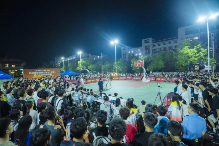 桂林雁山首届大学生(青年)路人王篮球争霸赛|高校晋级赛广西师大站比赛持续近6小时。图为入夜后的活动现场。雁山区融媒体中心供图。