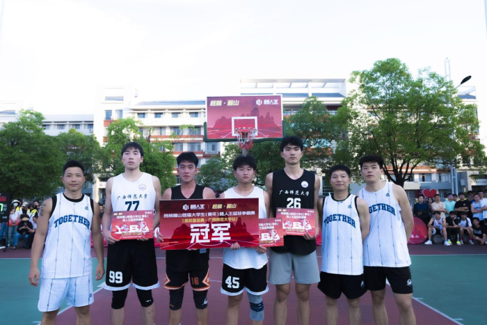 广西师范大学“种子队”之一的“正儿八经队”最终夺得晋级赛冠军,并与路人王明星球员合影。雁山区融媒体中心供图。